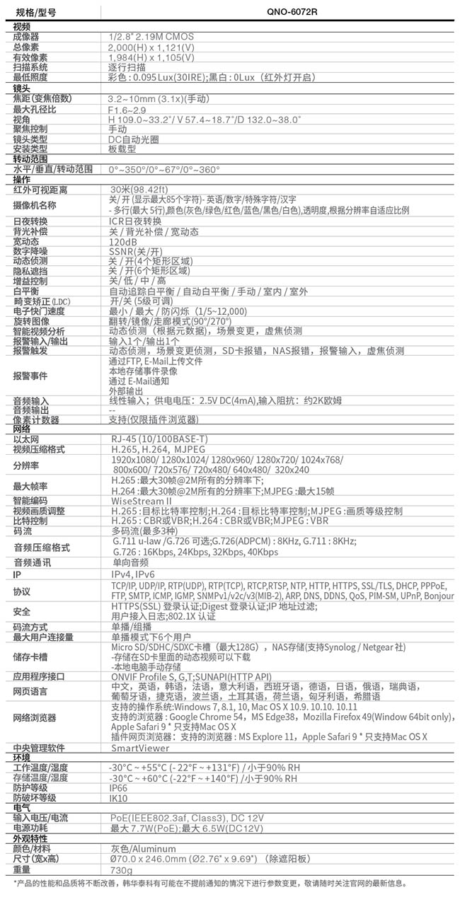 名  稱:QNO-6072R 韓華200萬像素全高清寬動態紅外網絡一體化攝像機