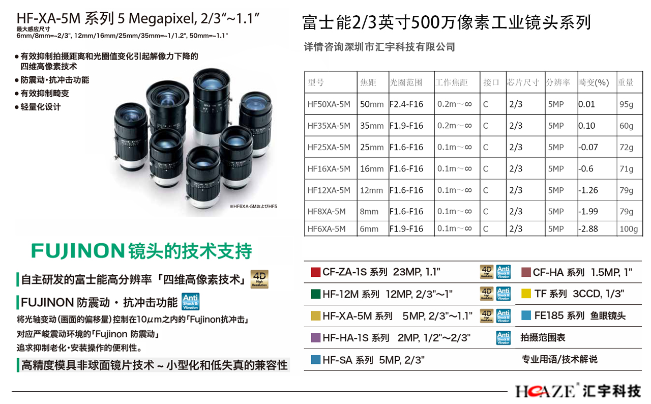 FUJINON HF-XA-5M系列鏡頭作為制造生產(chǎn)線產(chǎn)品檢查及測量中所使用的機器視覺攝像機鏡頭的高端系列,對應(yīng)2/3型感應(yīng)器?2.7μm像素間距,可在多樣的安裝條件下實現(xiàn)圖像由中心至外圍的均一平穩(wěn)的高解像性能。產(chǎn)品線中有焦距不同的5款機型,用戶可根據(jù)不同的用途,選取合適的焦距和視角。