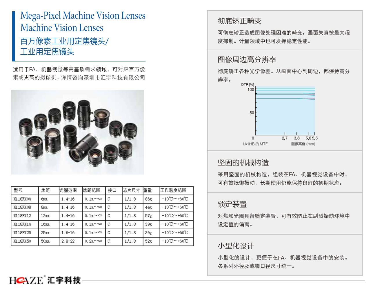 騰龍全畫面百萬(wàn)像素工業(yè)鏡頭M118FM50,1/1.8英寸,50mm定焦、手動(dòng)光圈F2.2-22,用于FA/機(jī)械影像等要求高畫質(zhì)圖像處理的超高性能單焦點(diǎn)鏡頭(定焦鏡頭)系列產(chǎn)品。通過支持Mega Pixel(百萬(wàn)像素)的卓越光學(xué)性能以及近距離拍攝時(shí)的性能提升,可支持各種圖像處理。;主要應(yīng)用于機(jī)器視覺MV、工業(yè)檢測(cè)ID、工業(yè)自動(dòng)化FA、智能交通ITS、智能安防CCTV等。