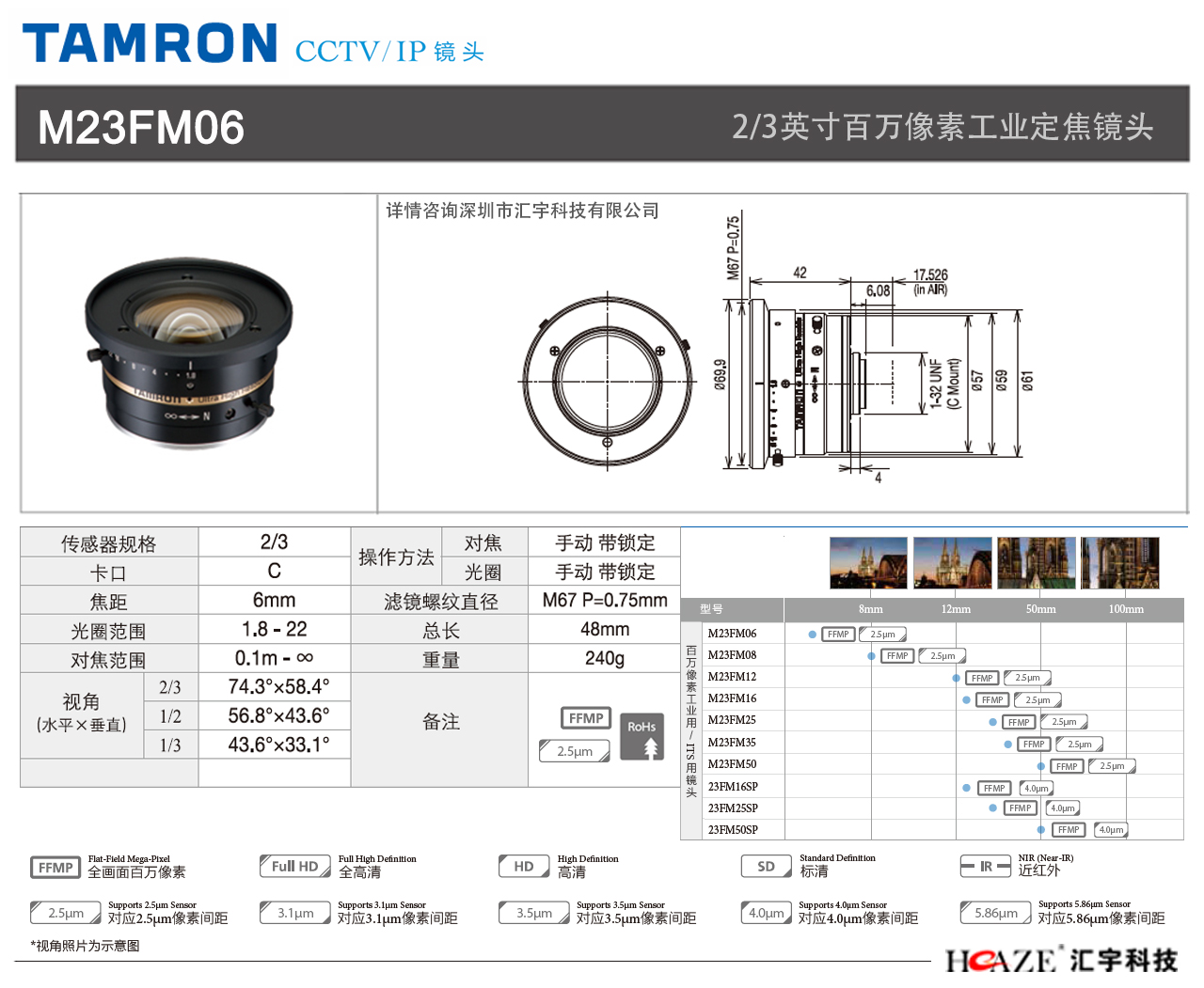 名 稱:M23FM06 騰龍TAMRON 2/3英寸全畫面百萬像素6mm定焦機器視覺鏡頭型 號:M23FM06