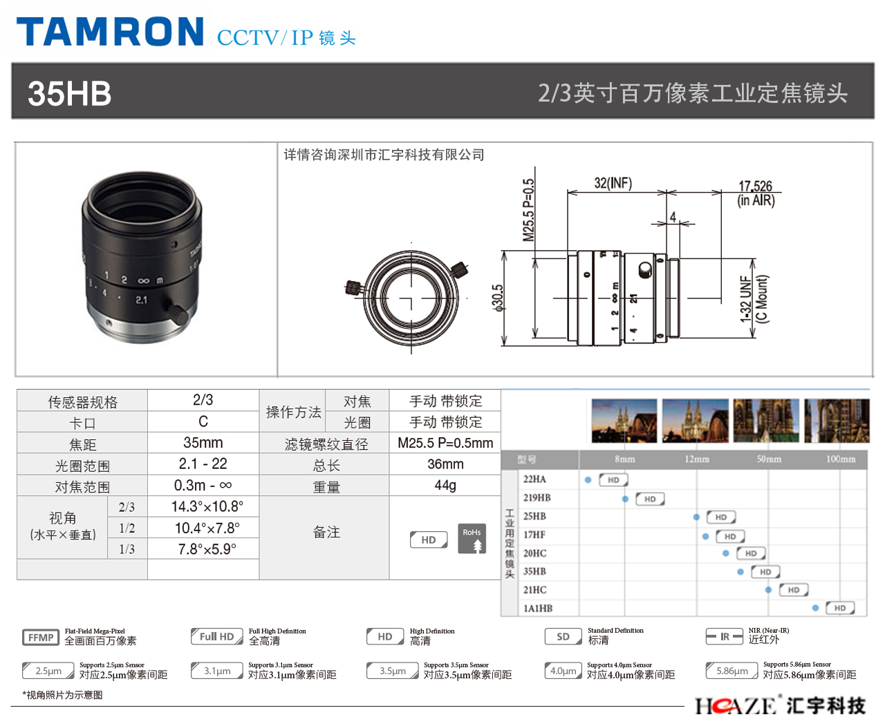 名 稱:35HB 騰龍TAMRON 2/3英寸35mm定焦百萬像素工業鏡頭型 號:35HB