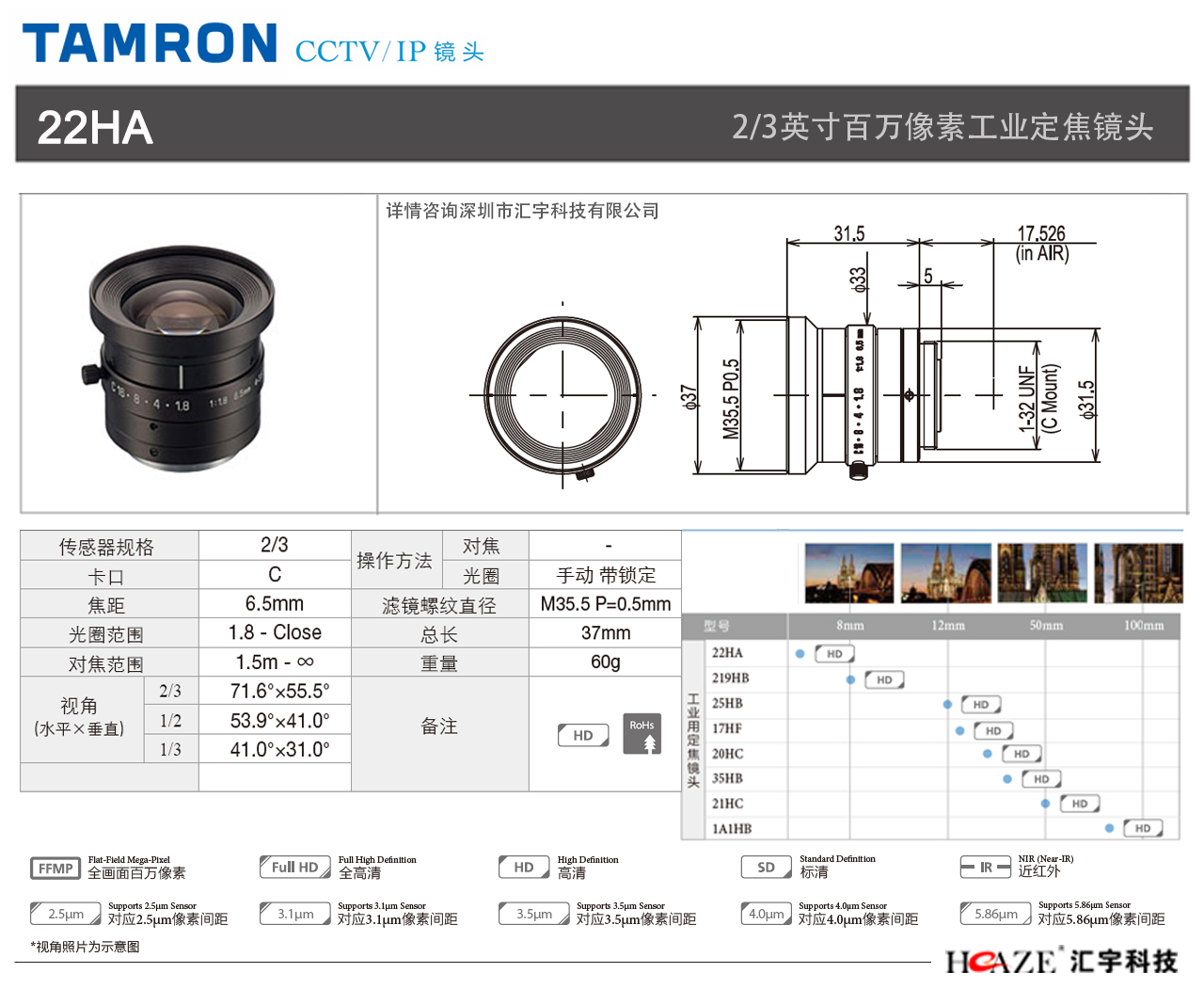 騰龍百萬像素工業(yè)鏡頭22HA,2/3英寸,6.5mm定焦、手動光圈F1.8~Close,械影像鏡頭;用于FA/機(jī)械影像等要求高畫質(zhì)圖像處理的單焦點(diǎn)鏡頭系列產(chǎn)品。 小巧的機(jī)身上凝縮了最新的技術(shù),實(shí)現(xiàn)了卓越的光學(xué)性能,主要應(yīng)用于機(jī)器視覺MV、工業(yè)檢測ID、工業(yè)自動化FA、智能交通ITS、智能安防CCTV等。